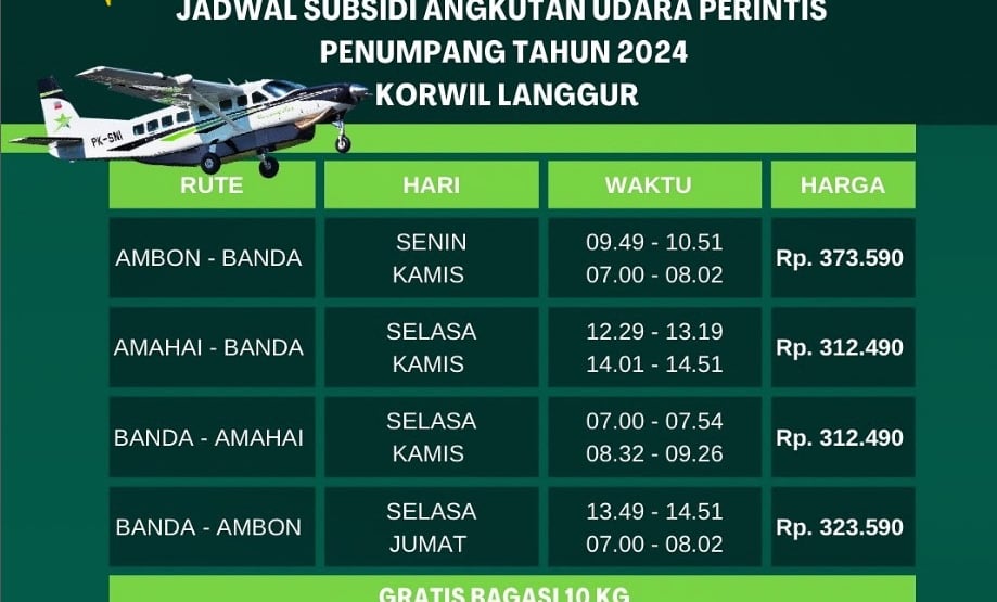 Rute pesawat Ambon-Banda Neira kembali beroperasi. Lihat jadwalnya di sini. kuota penumpang dan maksimal bagasi masing-masing penumpang. Plan your trip now!
