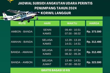 Penerbangan dari Ambon ke Banda Neira kini tersedia dua kali dalam seminggu, memberikan kemudahan bagi para pelancong dan penduduk lokal yang ingin bepergian antara kedua wilayah tersebut. Jadwal penerbangan ini penting untuk dicatat agar Anda dapat merencanakan perjalanan dengan baik dan menghindari ketidaknyamanan.